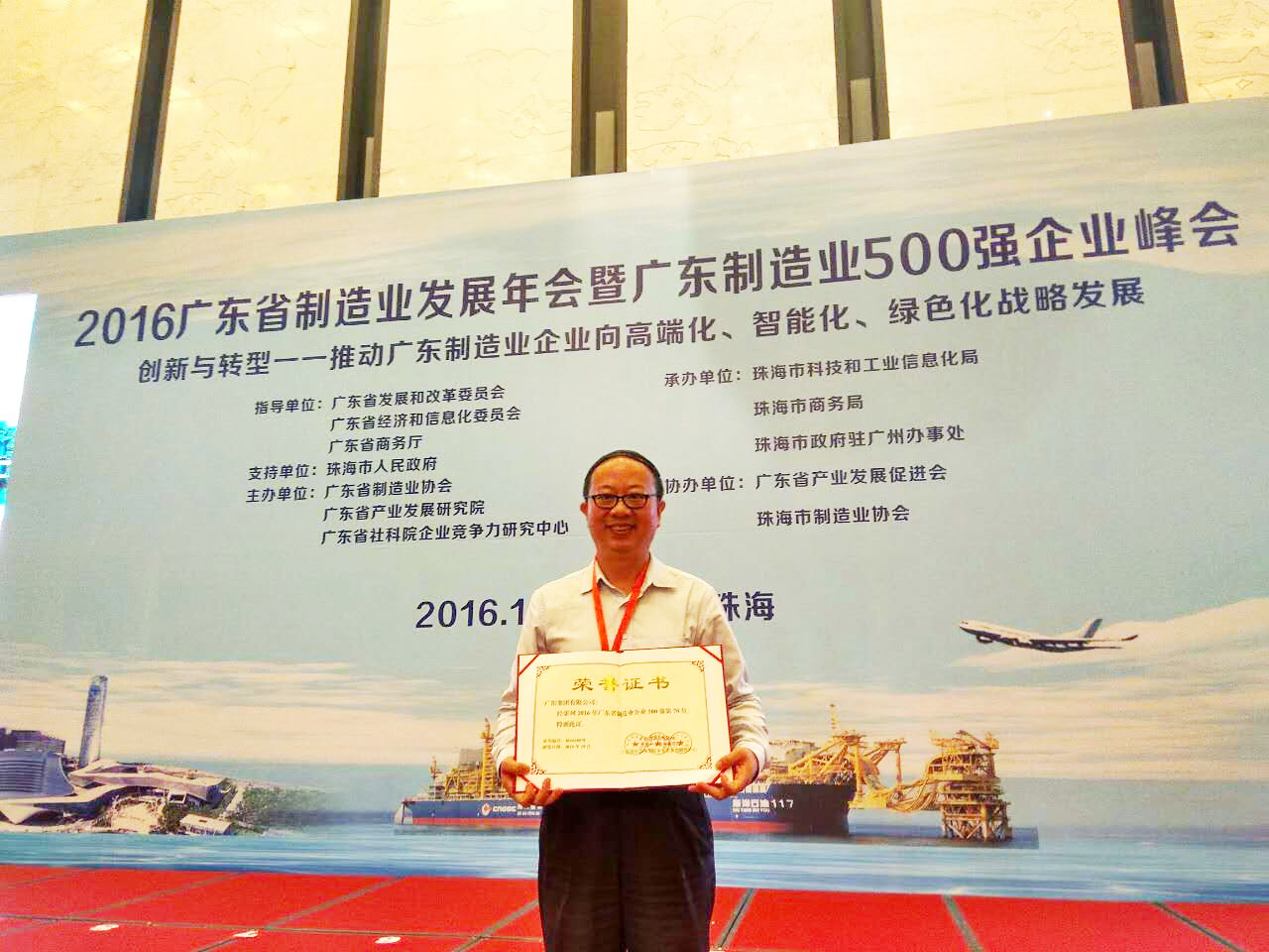 10月13日,2016年廣東省制造業(yè)發(fā)展年會(huì )暨廣東省制造業(yè)500強企業(yè)峰會(huì )在珠海市國際會(huì )展中心圓滿(mǎn)落幕。廣鋁集團喜獲2016年廣東省制造業(yè)500強企業(yè)第70名,生產(chǎn)總經(jīng)理劉煌萍代表公司參加了此次峰會(huì )并領(lǐng)取表彰證書(shū)。