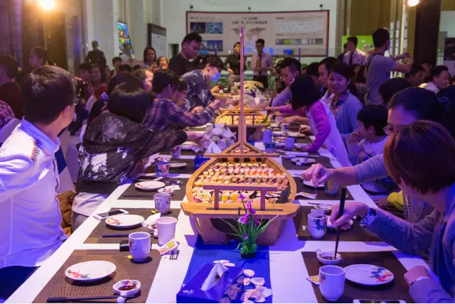 欣賞完園林美景,業(yè)主們移步回銷(xiāo)售中心進(jìn)行晚宴,映入眼簾的是一條條全鮮壽司船擺滿(mǎn)餐桌。船身足足兩米多長(cháng),船上擺滿(mǎn)了各種各樣的壽司和各種生魚(yú)片刺身,業(yè)主們紛紛表示被這場(chǎng)面震驚了,看著(zhù)這豐盛的壽司宴,都被吸引得垂涎三尺,食指大動(dòng)了??谏啾M興之余,在座的業(yè)主賓客都不忘與身旁素不相識的鄰居暢談起來(lái),他們當中有醫生,有企業(yè)高管,雖在不同行業(yè),但對廣鋁·荔富湖畔的共同認可,讓他們有聊不完的話(huà)題。