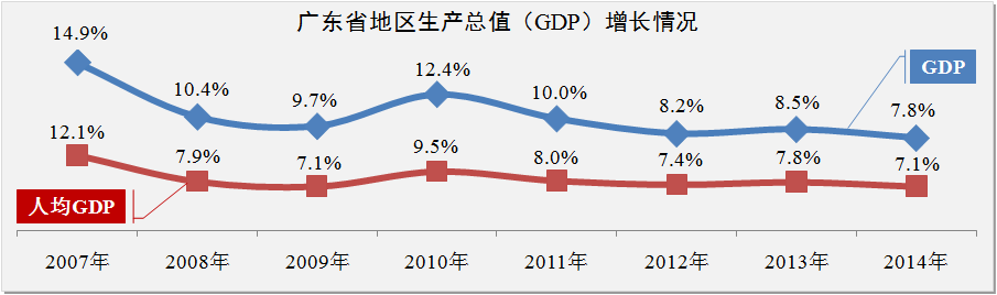 廣東經(jīng)濟方面。2014年廣東實(shí)現地區生產(chǎn)總值6.8萬(wàn)億,全國占比10.7%,同比增長(cháng)7.8%,較全國增速多0.4個(gè)百分點(diǎn)。其中第一產(chǎn)業(yè)增長(cháng)3.3%,第二產(chǎn)業(yè)增長(cháng)7.7%,第三產(chǎn)業(yè)增長(cháng)8.2%。人均GDP方面,全年人均GDP同比增長(cháng)7.1%,絕對收入首次超過(guò)1萬(wàn)美元??傮w而言,2014年全省經(jīng)濟運行雖有所回落,但運行基調基本平穩。