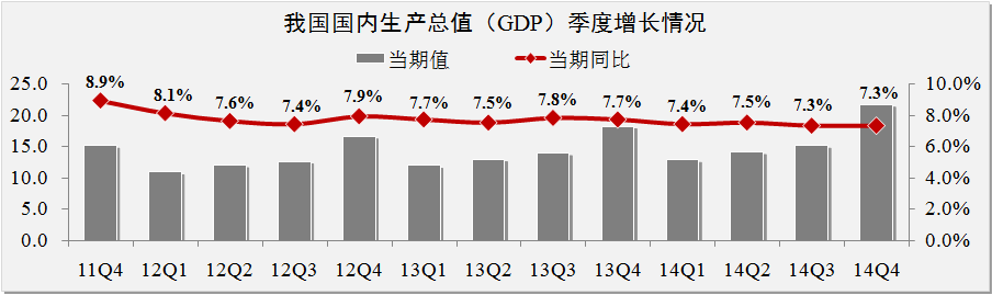 2014年度我國國內生產(chǎn)總值為63.6萬(wàn)億元,同比增長(cháng)7.4%,較2013年下滑0.4個(gè)百分點(diǎn)。其中,第一產(chǎn)業(yè)同比增長(cháng)4.1%,第二產(chǎn)業(yè)同比增長(cháng)7.3%,第三產(chǎn)業(yè)同比增長(cháng)8.1%。IMF預計2015-2016年我國經(jīng)濟增長(cháng)速度將繼續維持放緩趨勢,年度增長(cháng)率分別為6.8%和6.3%。研究指出,現階段國內當局更加注重化解短期信貸以及投資擴張帶來(lái)的資產(chǎn)負債表脆弱性風(fēng)險。