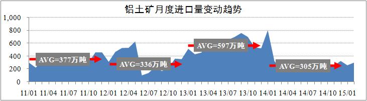 自2014年2月以來(lái),我國鋁土礦進(jìn)口量增長(cháng)一直保持在較低水平。監控數據顯示,2015年1-2月份進(jìn)口量分別為260萬(wàn)噸和300萬(wàn)噸,預計進(jìn)口量水平基本與2014年保持一致,全年月度平均進(jìn)口305萬(wàn)噸。當期,山東宏橋、中鋁國貿和信發(fā)鋁業(yè)成為主要進(jìn)口企業(yè),進(jìn)口量合計占比85%;澳大利亞、印度和馬來(lái)西亞則是主要進(jìn)口原產(chǎn)地,當期合計占比高達91%。