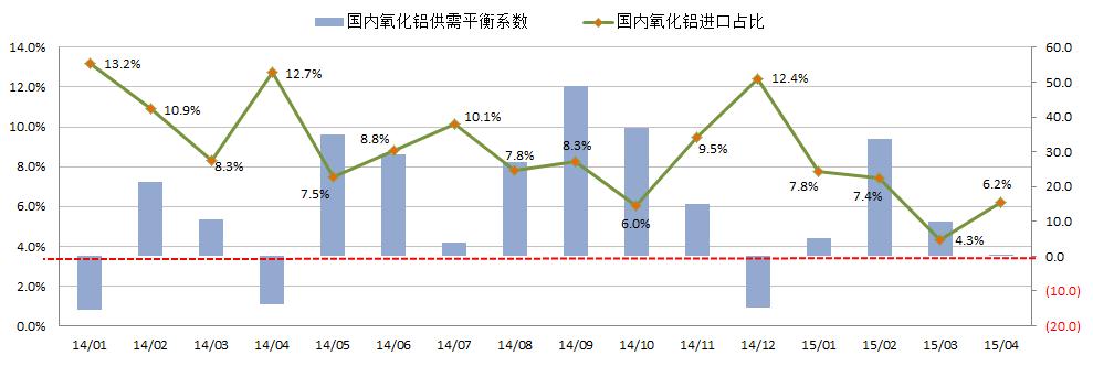 圖3:我國氧化鋁供需平衡系數及國內氧化鋁進(jìn)口占比變動(dòng)圖