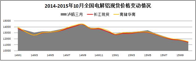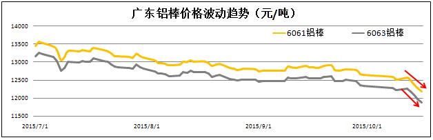 受全球鋁市疲態(tài)的影響,報告期內我國鋁棒價(jià)格呈現出階段性大跌的異?,F象。截至10月中旬,廣東6063型鋁棒價(jià)格下浮至10995元/噸,月化環(huán)比下降11.1%。鋁棒價(jià)格大幅下浮的另外一個(gè)主要原因是鋁型材市場(chǎng)需求在原本疲憊的環(huán)境下,原料需求進(jìn)入季節性淡季。