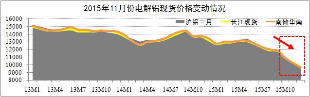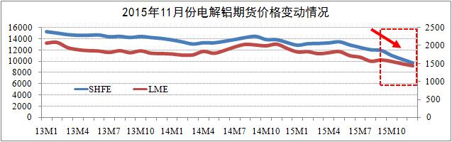 期貨市場(chǎng)方面截至11月24日,滬鋁三月結算跌至9670元,自跌破萬(wàn)元大關(guān)以來(lái),滬鋁主力合約日均漲跌幅為1.4%-2.1%;LME鋁三月結算跌至1446美元,其跌幅自今年8月以來(lái)開(kāi)始低于滬鋁跌幅。研究認為,滬鋁三月與LME鋁三月結算價(jià)將逐步筑底于9600元關(guān)口(Min.值),期鋁價(jià)格將迎來(lái)較大的反彈空間。