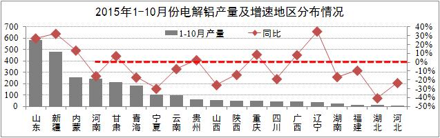 市場(chǎng)供給方面產(chǎn)能方面,10月全國電解鋁建成產(chǎn)能約3800萬(wàn)噸,運行產(chǎn)能3086萬(wàn)噸,開(kāi)工率為81.3%;產(chǎn)量方面,10月電解鋁產(chǎn)量259萬(wàn)噸,同比增長(cháng)9.8%,累計同比增長(cháng)4.8%,其中:山東、新疆、內蒙、河南等省份全國產(chǎn)量占比65%。截至11月18日,電解鋁合計減產(chǎn)389萬(wàn)噸,占國內總產(chǎn)能的10.3%,其影響效果將于2016年第二季度得到體現。