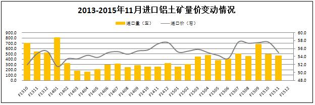 進(jìn)口市場(chǎng)情況。統計期內,進(jìn)口氧化鋁市場(chǎng)價(jià)格波動(dòng)趨勢基與國內市場(chǎng)基本一致。進(jìn)口量方面,11月全國進(jìn)口氧化鋁52萬(wàn)噸,較去年同期增長(cháng)18%,環(huán)比有所回落;價(jià)格方面,11CIF均價(jià)236美元,折合人民幣1529/,環(huán)比下降5.6%。進(jìn)口價(jià)格持續下跌折射出國際有色市場(chǎng)的悲觀(guān)氣氛仍在持續,同時(shí)進(jìn)口價(jià)格下跌速度放緩將會(huì )轉化進(jìn)口需求為國產(chǎn)需求。