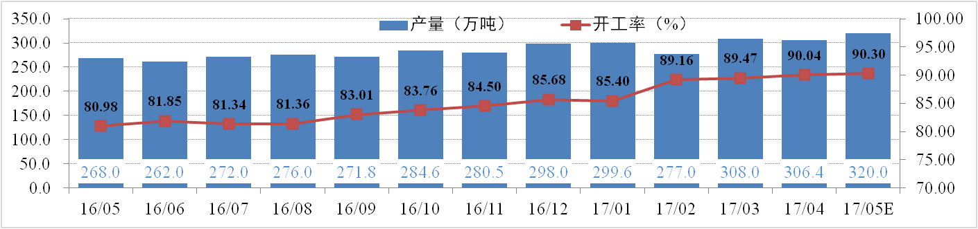 分析認為:供給側改革政策已經(jīng)落地,短期內仍難以改變供需格局,因此市場(chǎng)供應仍將保持在高位。預期5月產(chǎn)量320萬(wàn)噸,日化產(chǎn)量10.32萬(wàn)噸,供應持續增加。