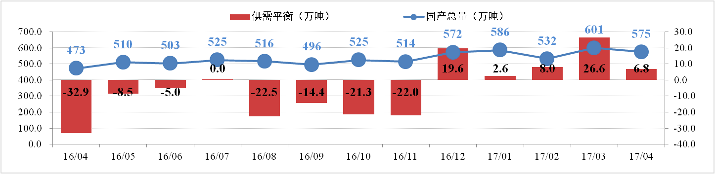 據行業(yè)統計數據,目前全國氧化鋁總產(chǎn)能為7723萬(wàn)噸,開(kāi)工產(chǎn)能7071萬(wàn)噸,開(kāi)工率91.56%。4月份氧化鋁產(chǎn)量約575萬(wàn)噸,同比增加17.2%。減復產(chǎn)方面,中鋁河南80萬(wàn)噸置換產(chǎn)能逐步投產(chǎn);中鋁山西、中鋁中州、中鋁遵義分別減產(chǎn)80萬(wàn)噸、25萬(wàn)噸和30萬(wàn)噸產(chǎn)能;三門(mén)峽義翔60萬(wàn)噸產(chǎn)能減產(chǎn)檢修。4月份國內氧化鋁供給存在約6.8萬(wàn)噸的過(guò)剩。