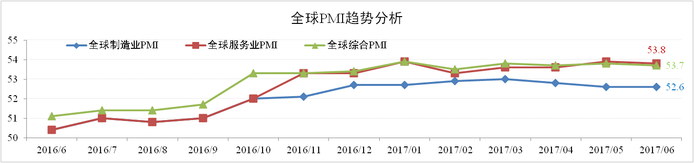 2017年以來(lái),全球經(jīng)濟延續復蘇態(tài)勢。據市場(chǎng)調研機構IHS Markit與摩根聯(lián)合發(fā)布的全球PMI數據顯示,6月全球制造業(yè)、服務(wù)業(yè)以及綜合PMI指數分別為53.8、53.7以及52.6,均處于擴張區間。同時(shí)6月亞太經(jīng)合組織將2017年全球經(jīng)濟增速預測由此前的3.3%調高至3.5%。