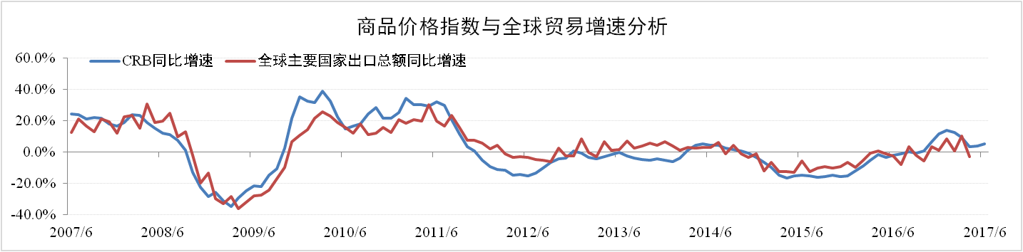 分析認為:本次全球貿易增速的提升更多的取決于商品價(jià)格增速。歷史數據表明商品價(jià)格指數總體上領(lǐng)先全球貿易增速約一個(gè)季度。目前商品價(jià)格增速已回落至低位企穩,表明全球商品價(jià)格已經(jīng)階段性見(jiàn)頂,全球貿易回暖增速或回落。
