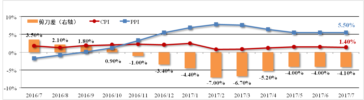 7月份全國居民消費價(jià)格指數(CPI)為1.4%,較上月縮小0.1個(gè)百分點(diǎn),主 要原因在于水果大量上市致使鮮果價(jià)格下降以及豬肉價(jià)格疲軟。生產(chǎn)價(jià)格指數(PPI)為5.5%,連續三個(gè)月持平。剪刀差較上月擴大0.1個(gè)百分點(diǎn)至-4.1%。