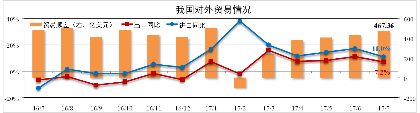 據海關(guān)總署數據,7月份我國進(jìn)出口總值3405.55億美元,同比增長(cháng)8.8%。 其中出口1936.46億美元,同比增長(cháng)7.2%;進(jìn)口1469.09億美元,同比增長(cháng)11.0%; 貿易順差為467.36億美元,環(huán)比上漲9.3%。