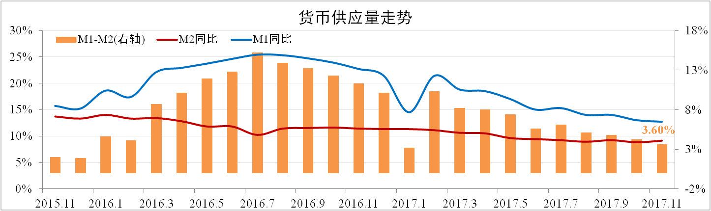 分析認為:貸款增加與財政存款支出增加是M2增長(cháng)的主要原因。一方面銀行減少非標投資轉向企業(yè)貸款,另一方面雙十一刺激居民短期消費貸增加??紤]到季末效應以及信貸投放額度,預計12月M2增速有小幅放緩。