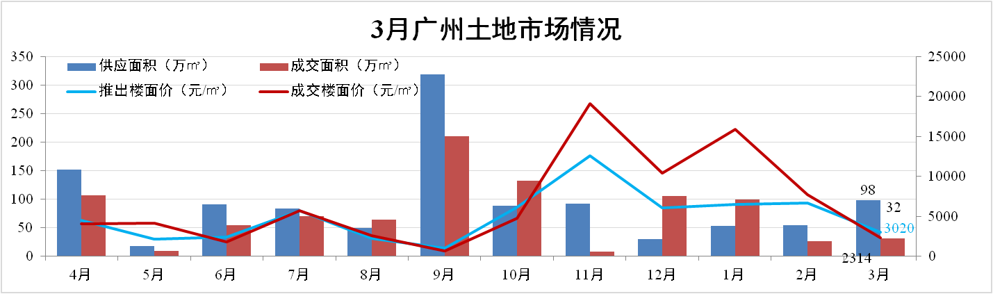 3月廣州市共推出10宗地塊,共有6宗成交。其中推出面積總額為98萬(wàn)㎡,成交32萬(wàn)㎡ ,推出樓面價(jià)3,020元/㎡,成交樓面價(jià)2,314元/㎡。