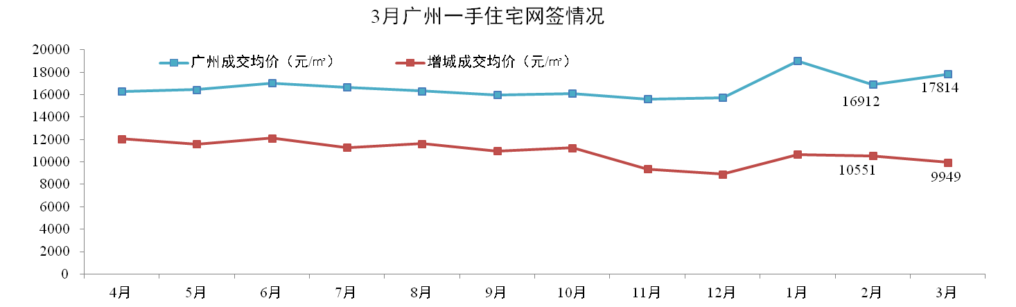 網(wǎng)簽價(jià)方面:3月份廣州一手住宅成交均價(jià)17,814元/m2,環(huán)比上升5.33%。其中,增城成交均價(jià)9,949元/m2,環(huán)比下降5.71%。