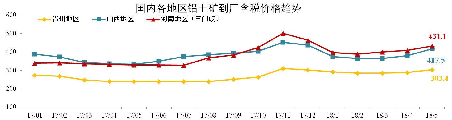5月份各地鋁土礦價(jià)格均小幅度增長(cháng)。截止2018年5月,貴州(AL:60%,A/S:5.5-6)到廠(chǎng)含稅價(jià)月均價(jià)303.4元/噸,環(huán)比上漲5.16%;山西鋁土礦417.5元/噸,環(huán)比上漲9.87%;河南鋁土礦431.1元/噸,環(huán)比上漲5.58%。