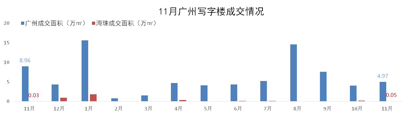 11月,廣州一手寫(xiě)字樓成交4.97萬(wàn)m²,環(huán)比增加22%;其中海珠區一手寫(xiě)字樓成交0.05萬(wàn)m²,環(huán)比減少74% 。