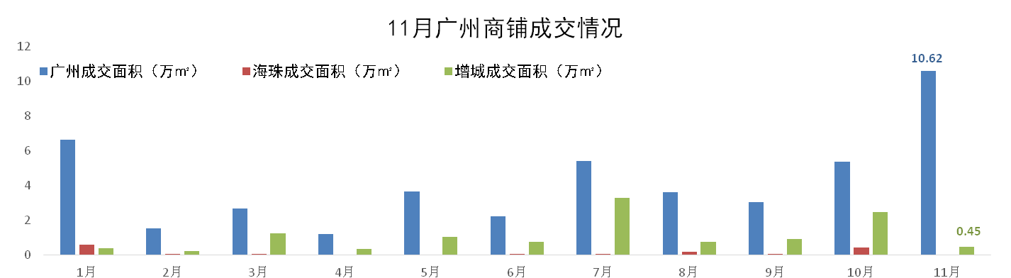11月廣州一手商鋪成交10.62萬(wàn)㎡,環(huán)比增加54%。按區域劃分,增城區一手商鋪成交0.45萬(wàn)m²,環(huán)比減少81%,占全市成交量不足一成。按商鋪類(lèi)型劃分,社區商鋪成交占比8成。