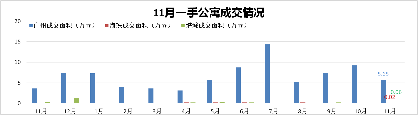 11月廣州一手公寓成交1,047套,成交面積5.65萬(wàn)㎡,環(huán)比減少39%。海珠區成交面積0.02萬(wàn)㎡,環(huán)比減少25%;增城區成交面積0.06萬(wàn)㎡,環(huán)比減少36%。