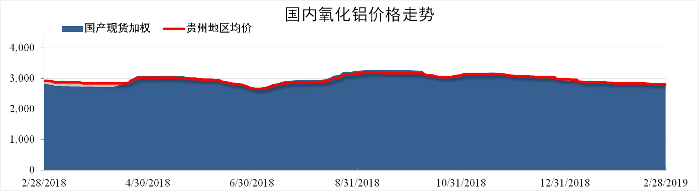 截至2月28日,國產(chǎn)氧化鋁現貨加權均價(jià)為2812元/噸,同比下降0.81%,環(huán)比下降2.18%。貴州地區氧化鋁現貨加權均價(jià)為2829元/噸,同比下降3.37%,環(huán)比下降2.22%。