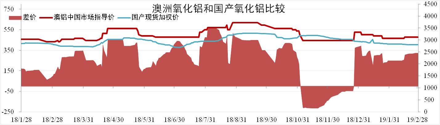 截至2月28日,國產(chǎn)氧化鋁現貨加權均價(jià)為2812元/噸,環(huán)比下降2.41%。澳鋁中國市場(chǎng)指導價(jià)為3108元/噸,同比上漲3.9%,國產(chǎn)氧化鋁價(jià)格較澳鋁指導價(jià)低296元/噸。