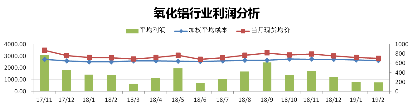 2月份國內氧化鋁加權平均成本為2622元/噸,較上月下降2.02%。當月全國氧化鋁現貨成交均價(jià)為2812元/噸,較上月下降2.19%。理論氧化鋁行業(yè)平均利潤水平為190元/噸。